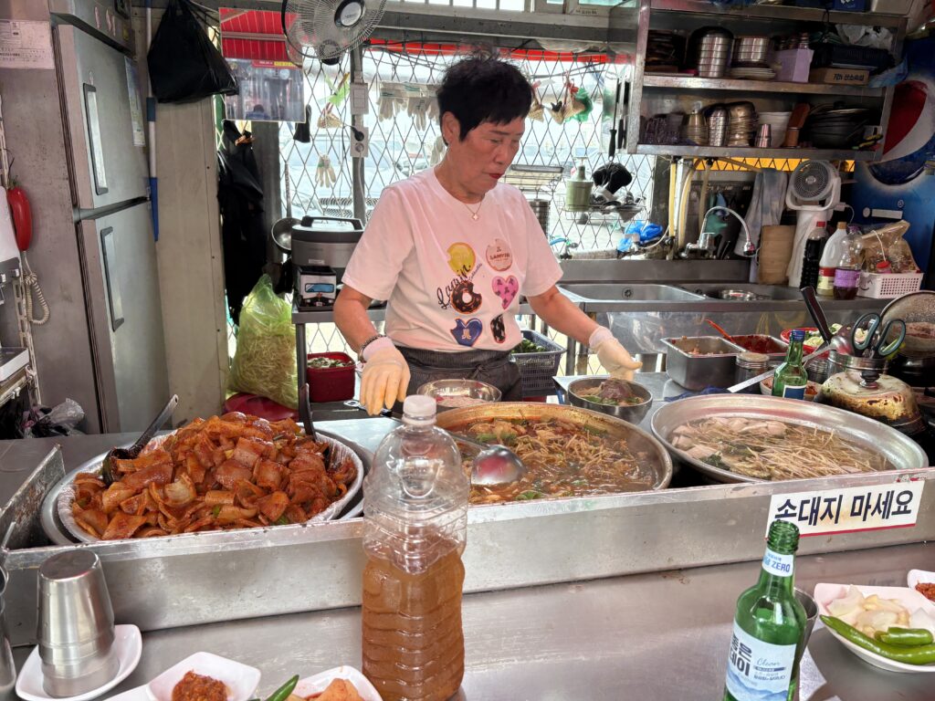この日も朝から暑くて額に汗しながら食べているとオモニが扇風機をこちらに向けてくれて優しい気遣いに感激ソンジもクセがなくとても美味しかったです。人気なのがわかります。凉