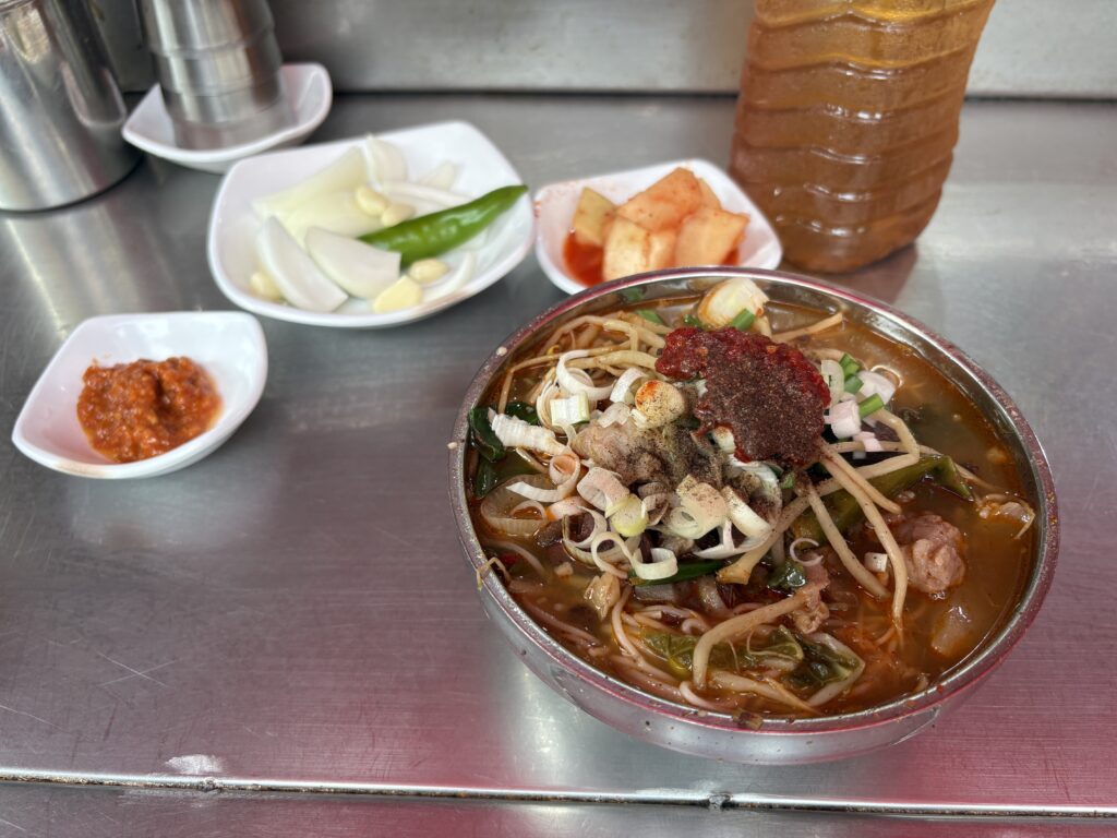 こちらで朝ごはんにと調べていたソンジクッパなる物をチョイス‼️ソンジとは牛の血の固めた物らしくちょっと抵抗有りつつもトライ