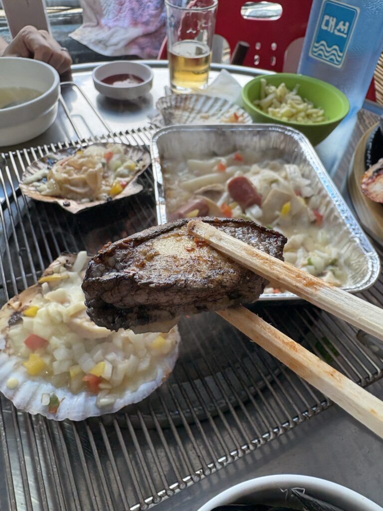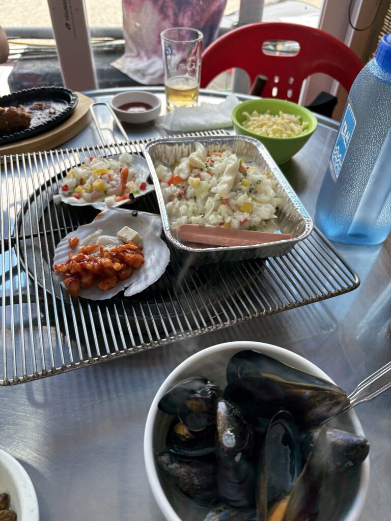 海を見ながら海鮮焼きを頬張りビールで乾杯❣️