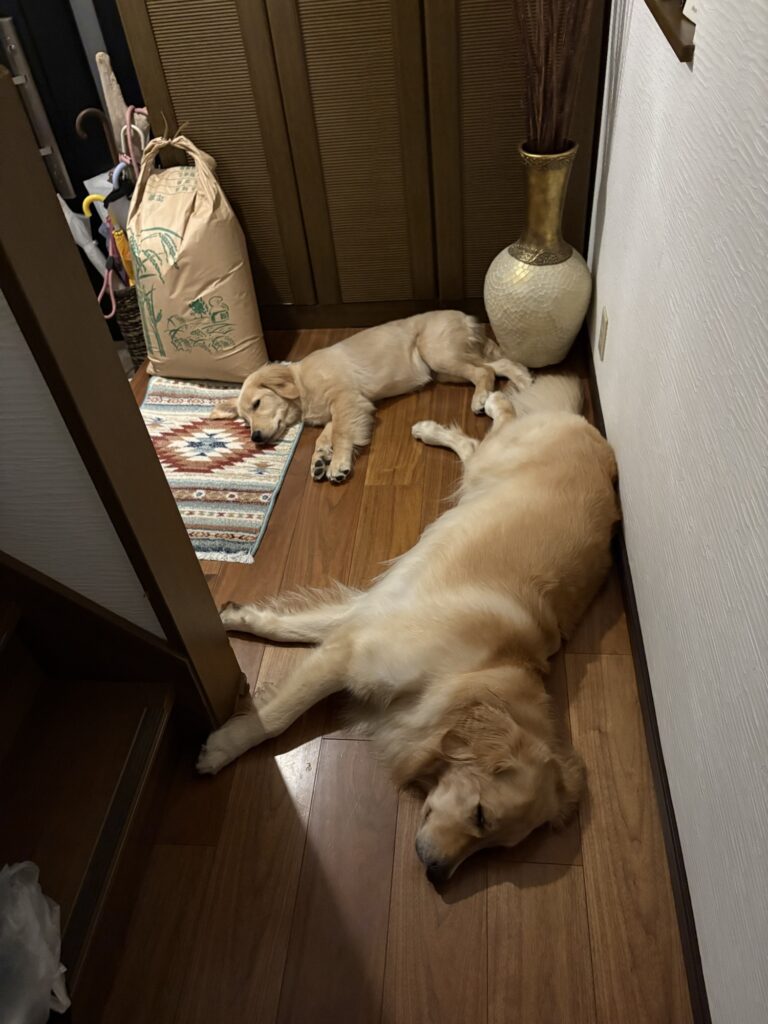 近頃の2匹ですが、少し気温が下がったのか玄関タイルからフローリングへ移動してきました。笑